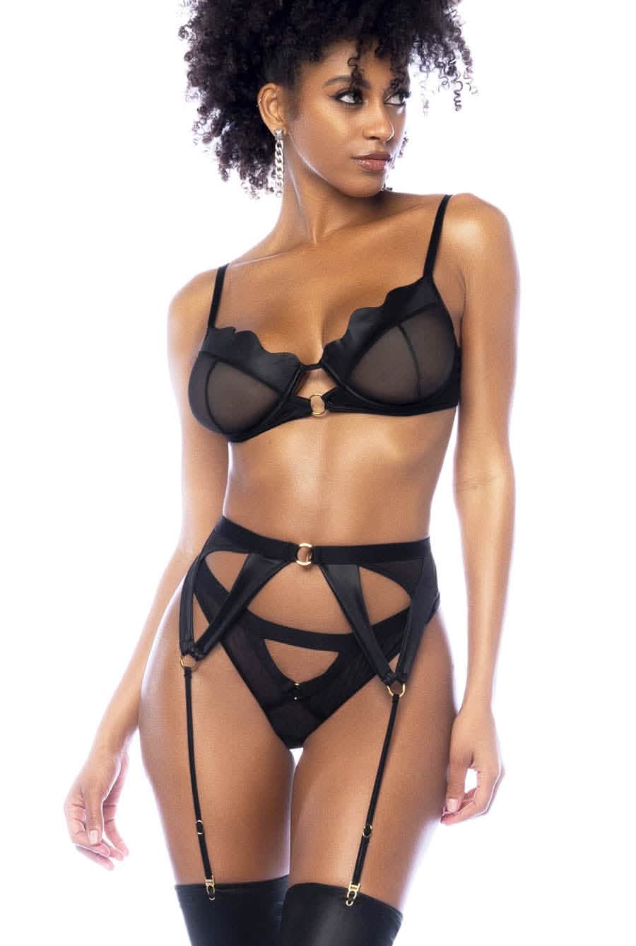 Indulge in the essence of sophistication and allure with this captivating three-piece lingerie ensemble. Crafted to enhance and celebrate your curves, this set features an underwire bra designed with adjustable straps for a personalized fit. The collection is complemented by a matching thong, which artfully combines the sleek appeal of matte faux leather with the delicate transparency of sheer mesh, creating a striking contrast that is both bold and refined.