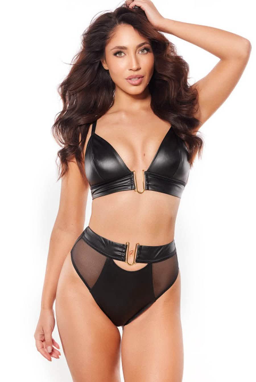 Faux leather in a sensual erotic design, features plunging front and gold charm buckles details in a underwire plunge style longline bra in faux leather, sheer mesh and matching high waist panty in a unique luxury design handmade in Europe.