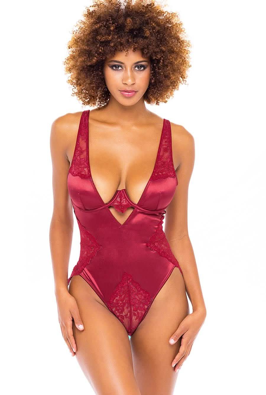 Embody the seductress in you with our soft luxe satin bodysuit with plunge front and eyelash lace, snap crotch and underwire cups.