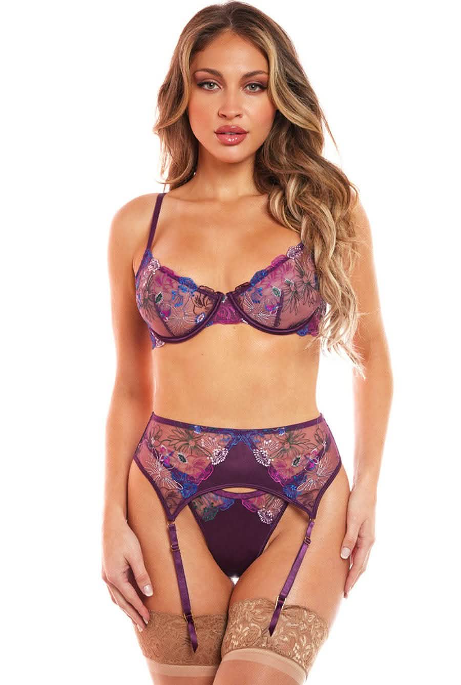 Purple Floral Lace Bra, Grstring & Garterbelt Set