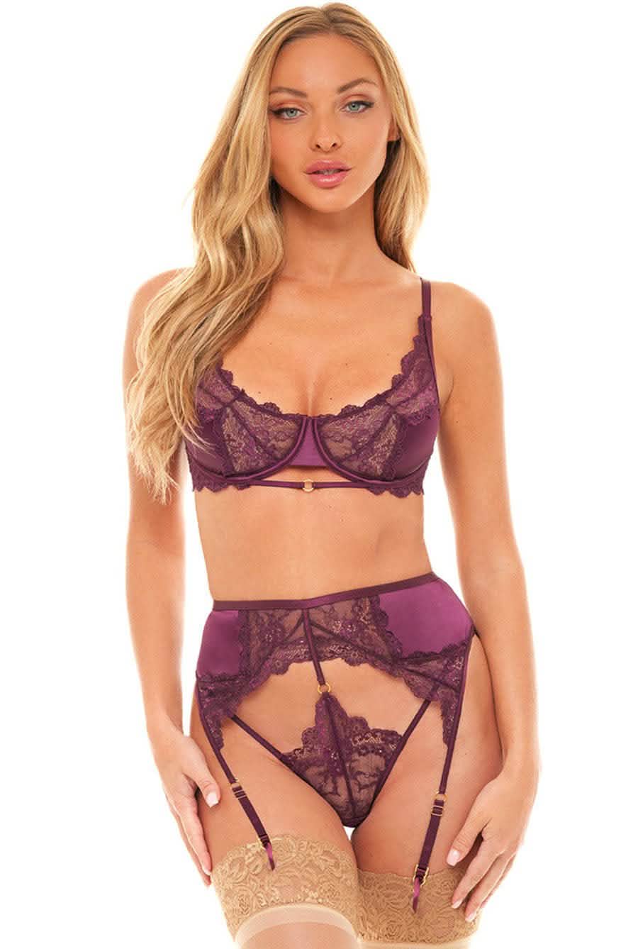 Purple Satin Lace Bra, Grstring & Garterbelt Set
