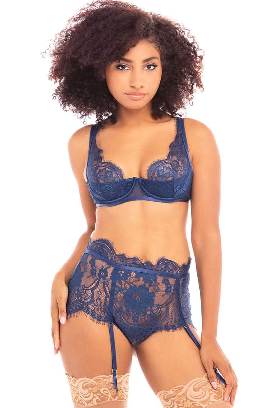 Feel royal in our stunning blue lace eyelash lace stretch fabric bra set with underwire satin booster cups.