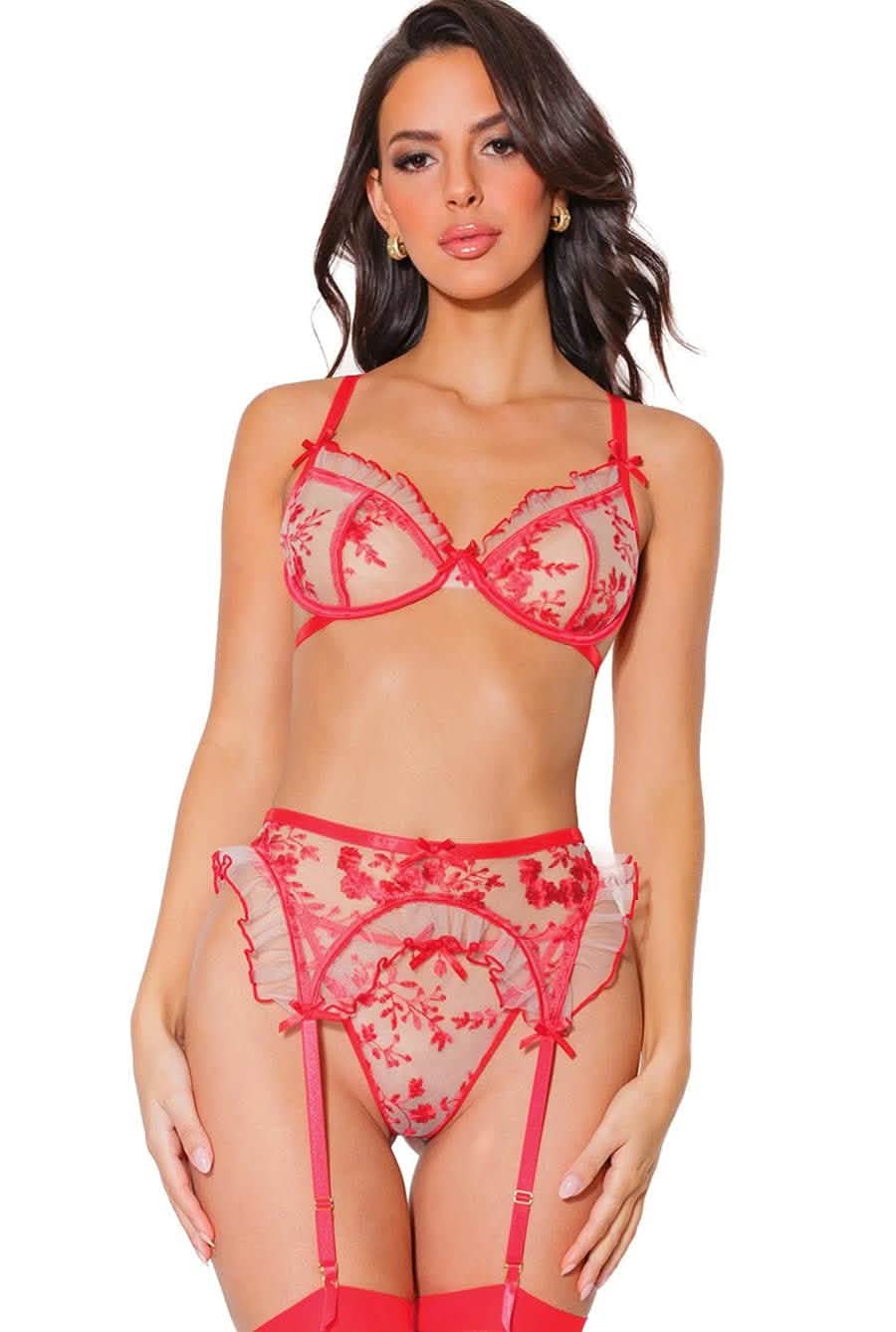 Sheer Floral Red Lace Tule 3 Piece Lingerie Set