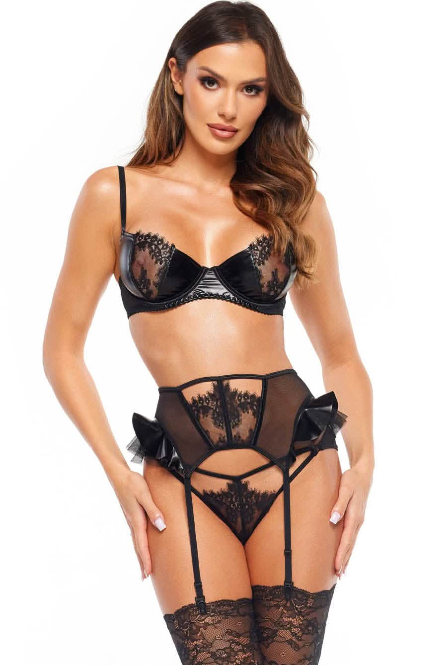 Discover the allure of this exquisite lingerie set, where sophistication meets an audacious style. Crafted from a blend of black lace, tulle, and wetlook fabric, this ensemble enhances feminine silhouettes, instilling a sense of confidence in the wearer.