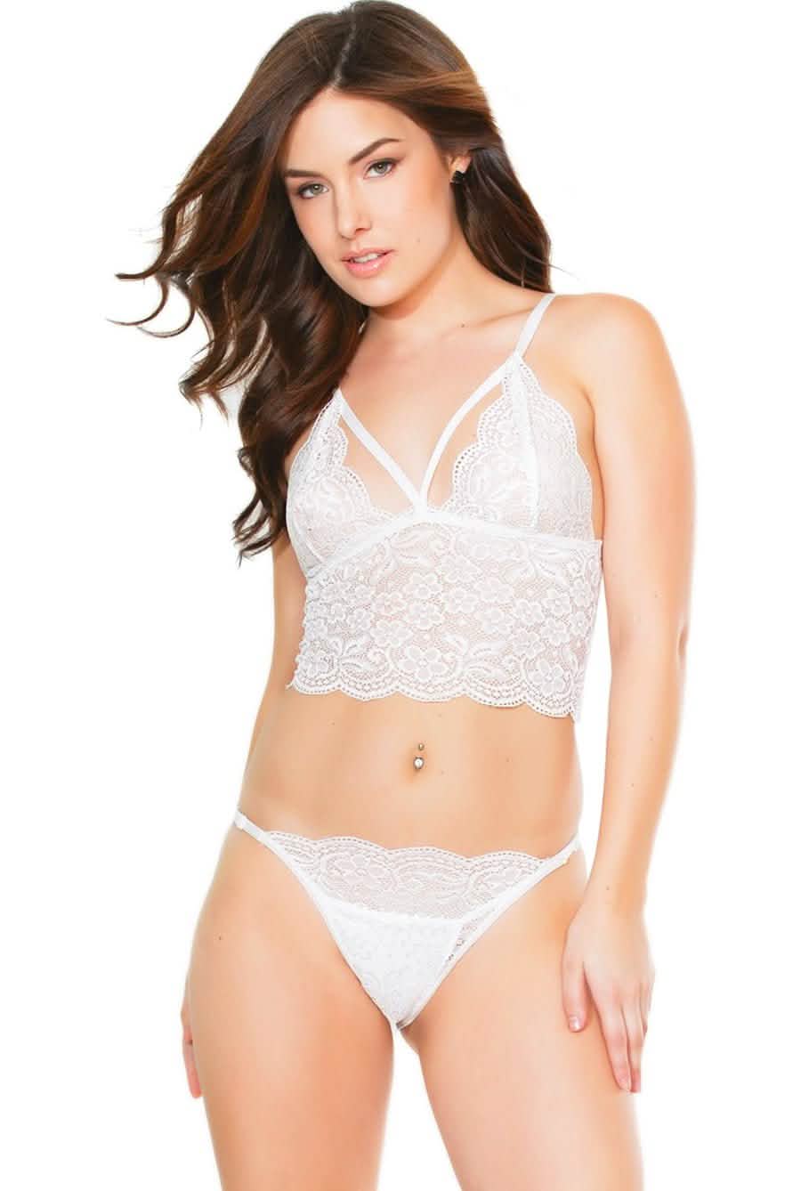 White scalloped lace bralette with matching open crotch panty is a fun and flirty lingerie set for brides or lovers of white.